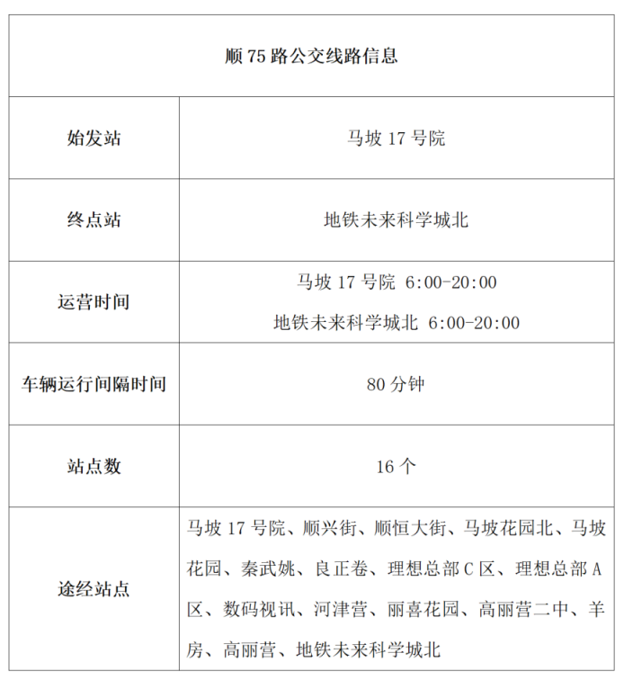 区交通局组织北京骏马客运有限公司深刻调研体育游戏app平台,屡次踏勘走漏,于5月20日开灵通75路(马坡17号院—地铁改日科学城北站)公调换露。